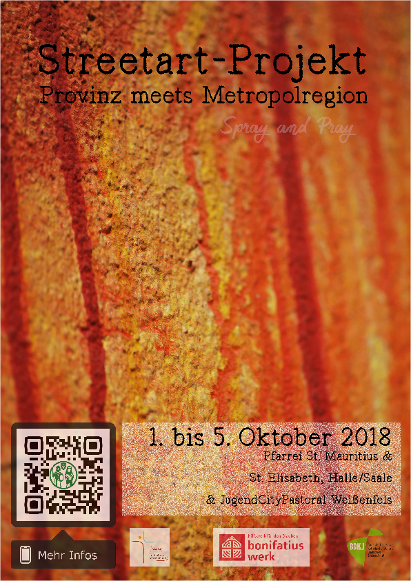 Deshalb wollen wir mit euch die Stadt Halle aus einem künstlerischen Blickwinkel kennenlernen. Außerdem laden wir euch ein, selbst kreativ zu werden. Wir wollen gemeinsam Ideen sammeln und Entwürfe und Skizzen erstellen, um anschließend eine Außenmauer des Grundstücks der Propsteikirche in Halle zu gestalten. Ein Mitglied der Freiraumgalerie Halle und Lehrer des Elisabethgymnasiums wird die praktisch-kreativen Arbeiten betreuen und anleiten. Übernachten werden wir in den Räumen der Moritzkirche in Halle (An der Moritzkirche 8, 06108 Halle).